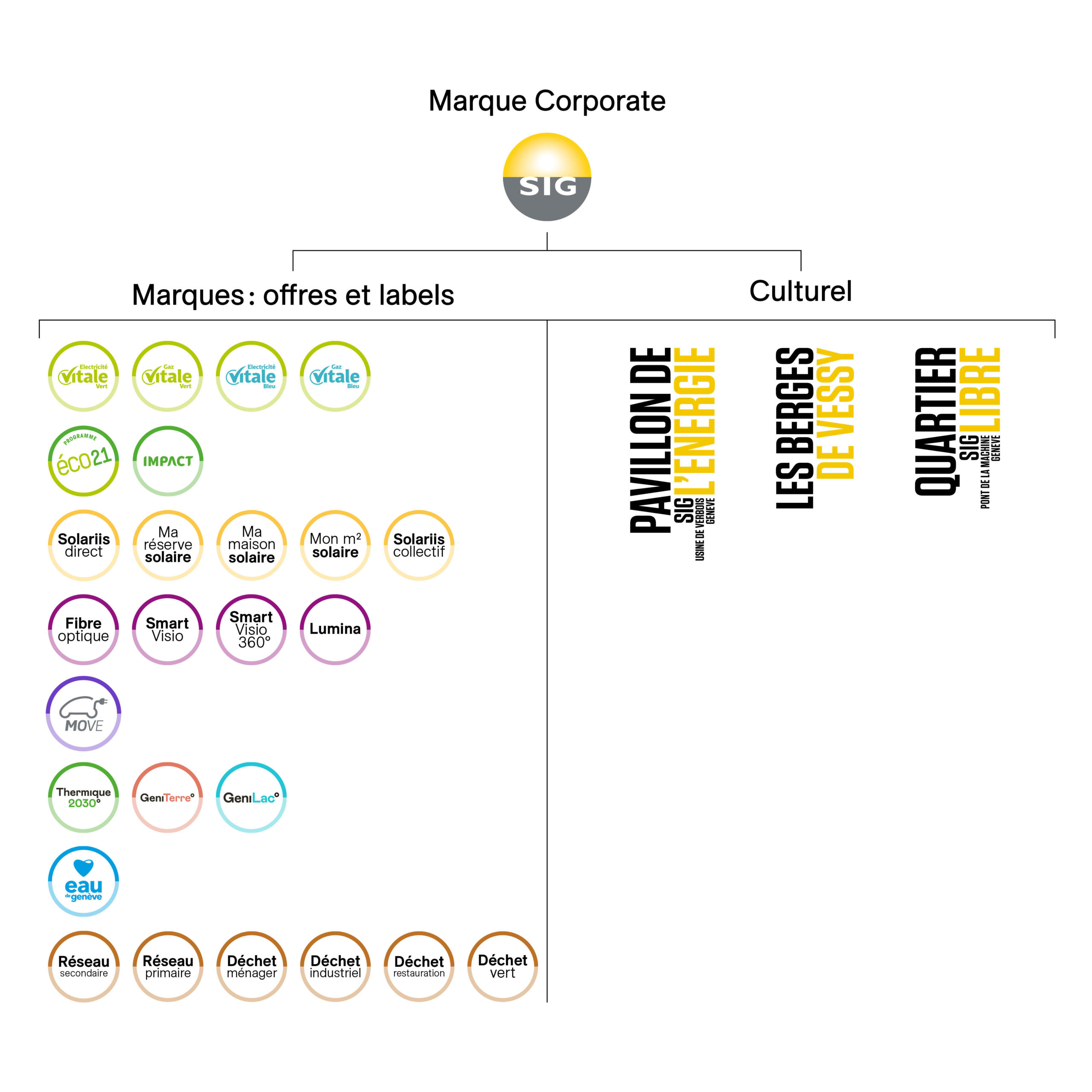 Les marques : offres et labels sont caractérisées par une identité personnalisée (logotype, ligne graphique, couleurs), dont le style graphique fait référence à la marque corporate. Elles sont présentes sur la plupart des documents SIG.