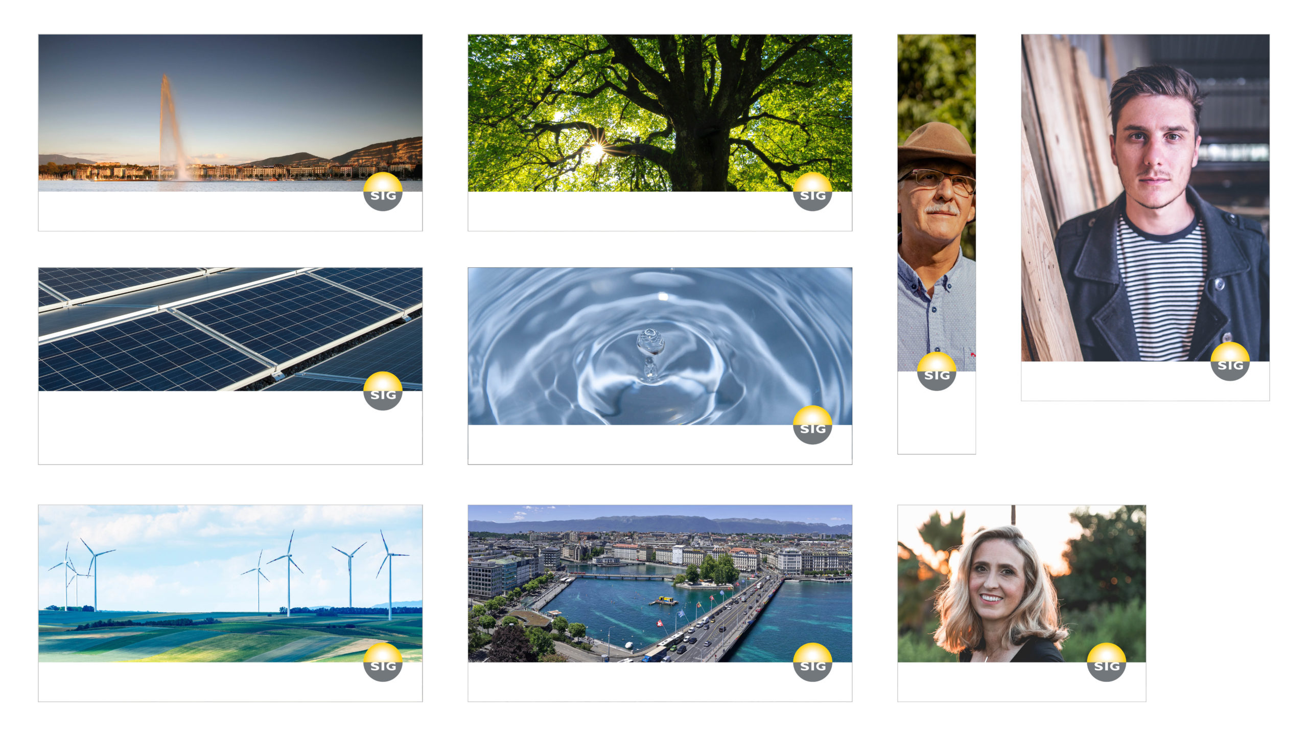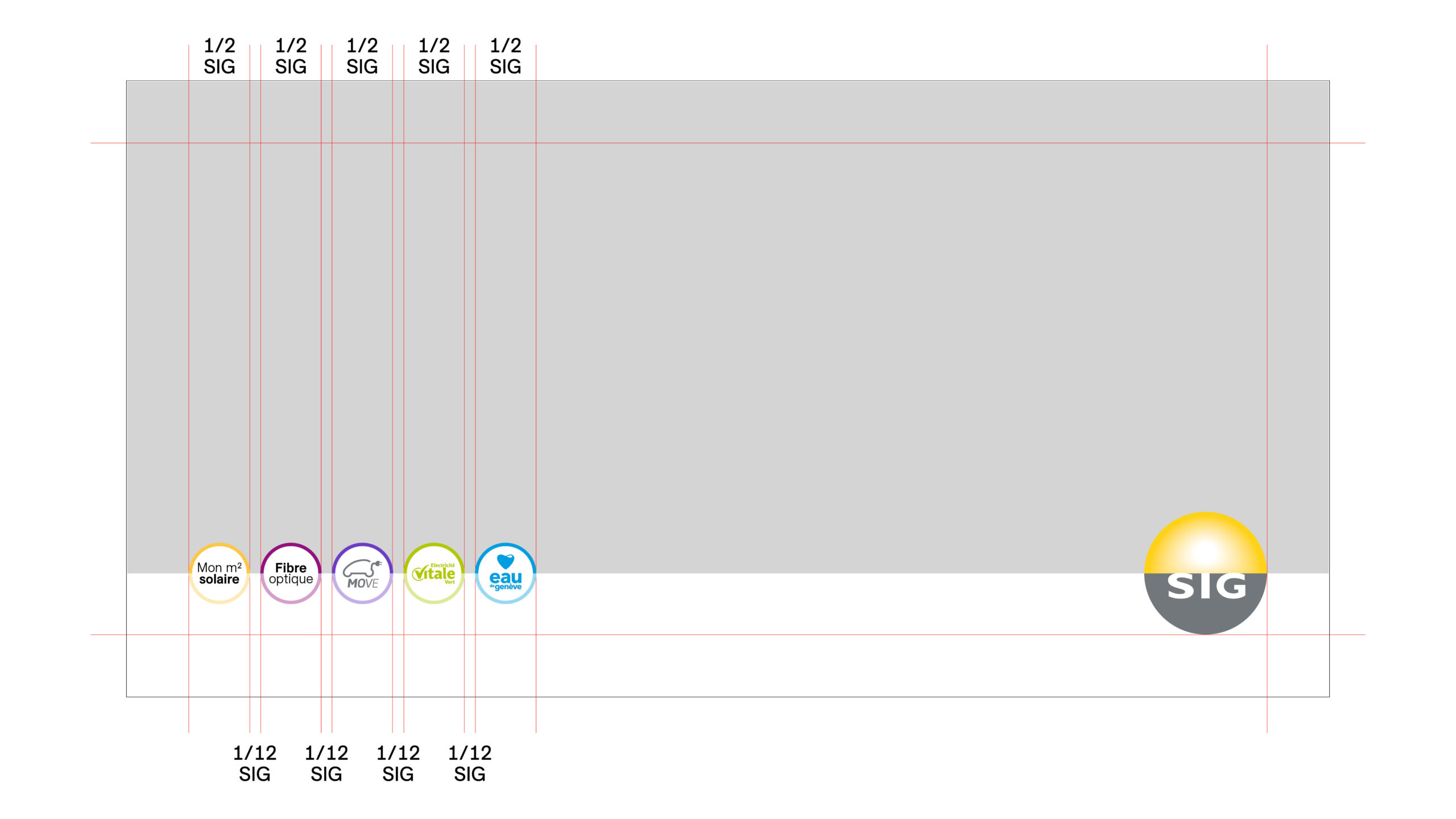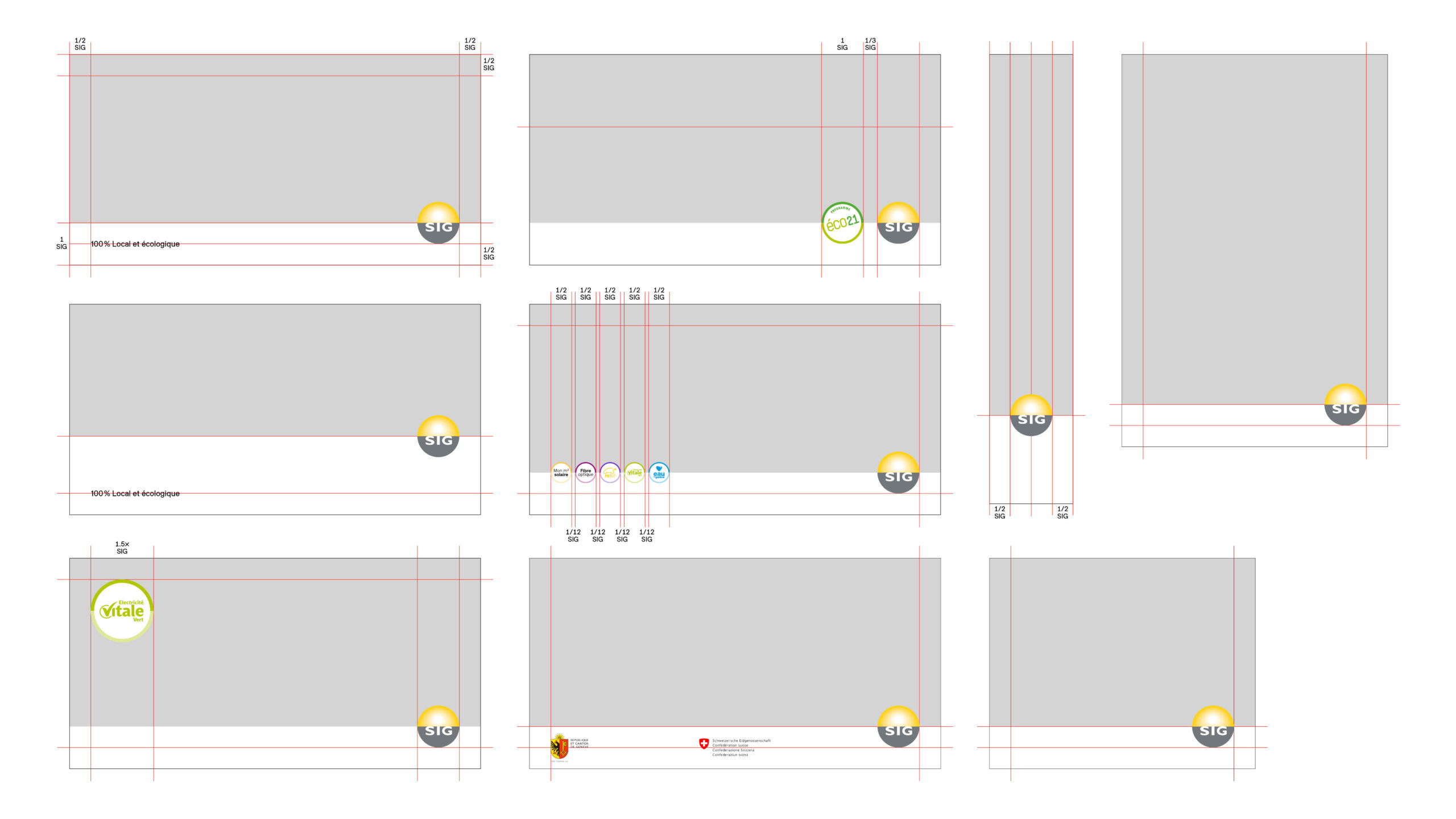 Lorsque plusieurs marques : offres et labels ou marques-produits sont associées dans la communication, leurs logos sont placés sur la même ligne horizontale que celui de SIG. Ils correspondent à 1/2× le logo SIG et sont espacés entre eux de 1/12 du logo SIG.